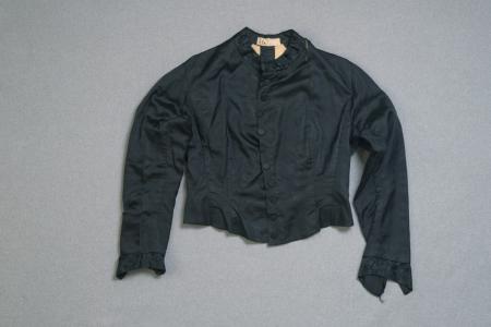 Brudklänning bestående av 1) liv med ärmar och 2) kjol. Livet av svart sidentyg har 3 cm hög uppstående krage av svartblommigt siden, ingen urringning, en rad, 10 st., svarta knappar framtill, ärmuppslag av svartblommigt siden i bredare uddar mot undre sömmen,bröstsöm, 2 sömmar under armen, mittelsöm och svängda sidosömmar i ryggen, skört nedtill något nedanom livets kant, inga knapparbakom. Kjol av svart taft, rynkad upptill, med ett 4 cm brett rött siden-band 15 cm från fållen.