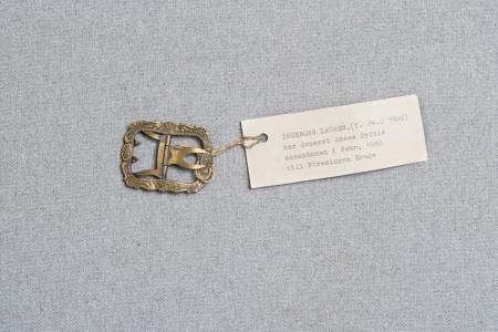 Kommentar: Spännet har en lapp med texten: INGEBORG LAURÈN, (f 24.2 1900) har donerat dessa Pyttis skospännen i febr. 1980 till föreningen Brage. B: 5,5 cm, H: 4,2 cm.