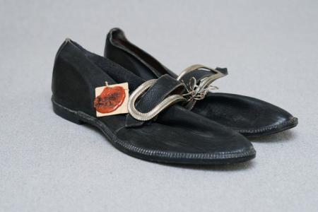 A19. Ett par skor av svart läder, med låga klackar, toffelfason, svart rosett framtill. Kommentar: Silverfärgat spänne, svart läderbotten. Lapp med texten ”Svenskfinland Föreningen Brage Närpes Österbotten”. B: 9,5 cm, H: 9 cm, L: 29,5.