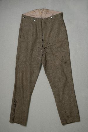 Grå vadmals långbyxor, framtill nutida snitt, fickor i sidosömmarna. Nertill vid yttersömmen en 2 cm bred 23 cm lång utanpå sydd list m. en överklädd