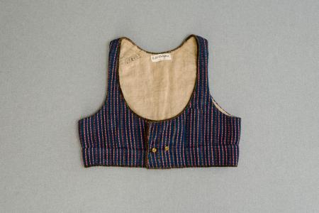 Liv av blåbottnigt finnkorsatyg, vanlig Närpes snitt, svart sammetskant kring halsrurringningen, framkanterna o. nedtill. 1 par urgröpta mässingsknappar framtill, inga i ryggen.
