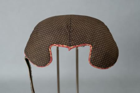 Bomullskattun, kantad med rött tryckt kattun. Framtill hjärtformad. En mycket grund mössa av ”Närpes Fason”, tre raka veck. Dragbanden av tvinnat lingarn. Foder av linnelärft. Banden fastsydda i ena ändan av mössan. Välbevarad. B: 17 cm, H: 7 cm. Band, B: 1 cm, L: 57cm.