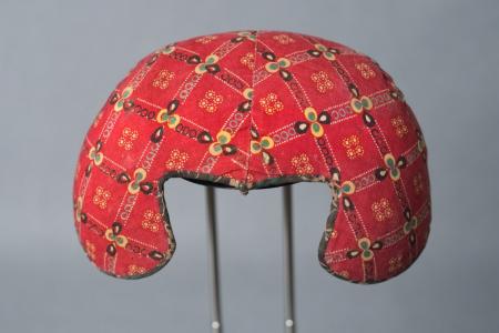 Bindmössa av rödbottnigt kattunstyg o. med vävda band i rött, gult, blått o. grönt runt hakan.