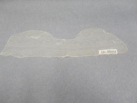 Formklippt stycke till bindmössa i tyllspets. Kommentar: Mycket tunn tyllspets, formklippt. Tråd sydd runt alla kanter, några hål reparerade med grövre garn. Stycke; H: 10 cm utan tygstycke, L: 32 cm.