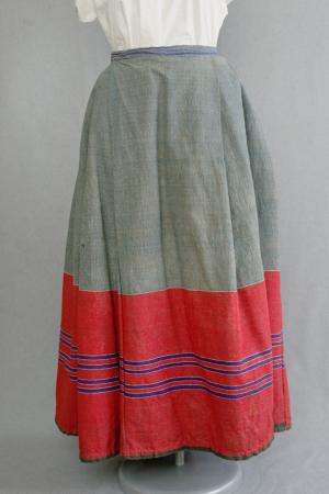 Kjol av gråblått tvåskaftigt tyg med bred röd bigärning med gredelina o. vita ränder, vävd i bottenväv, tätt rynkad upptill, gredelin linning o. grön fåll.