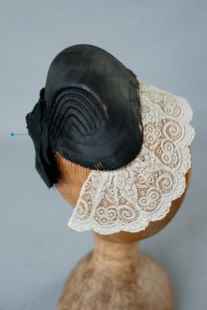 Bindmössa, stor svart med rosett, 6 veck i vinkel.