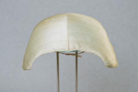 Sidensatin, nästan rak i framkanten. Fyra stickningar framtill. Foder av tryckt stormönstrat kattun i gröna nyanser. Dragband tvinnat lingarn. Som stoppning syns kardad ull. Skador i framkanten, kraftigt inböjd i sidorna. B: 19 cm, H: 8 cm.