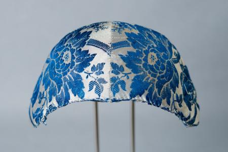 Liten mössa med rak framkant. Mönstervävt siden på ljus botten med mörkare blåa blommor och blad. Foder av tunt linnetyg. Fem rader stickningar som dekoration. Stommen något skadad, mjuk. B: 20 cm, H: 6 cm.
