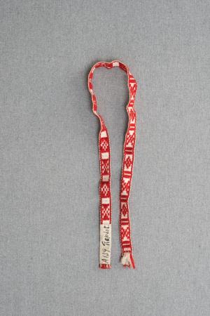 A139. 9/4 1925 Replot, Kyrkoby Prov på förklädesband vävt på grind i rött o. vitt. Erhölls av Stina Sand, gästgiveriet. Yngvar Heikel Gåva Kommentar: B: 1 cm, L: 62 cm.