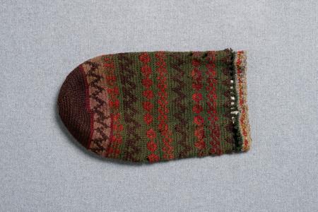 Tobakspung, virkad i mossgrönt med figurer i rött, rödbrunt, gredelint m.m.