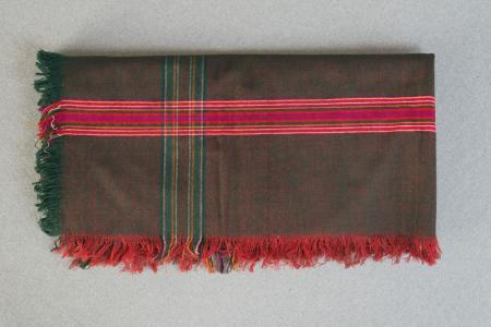 Enfärgad duk med bigärning i rött, rödbrunt, gult, vitt, grönt; grönröd skiftande botten; halvylle, lärftbindning.