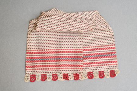 Inslagsmönster i bomull. Virkad spets. Stadkant i ena och fåll i andra kanten. Välbevarad. B: 39 cm, L: 174 + 5 cm.
