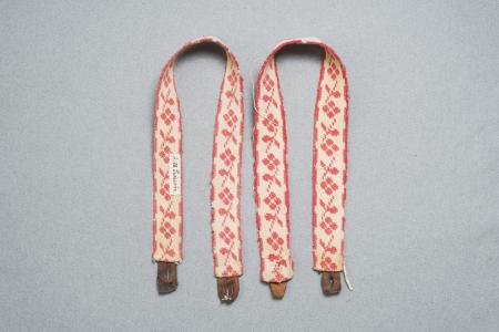Hängslen, virkade i vitt o. rött, två hängselband för sig.