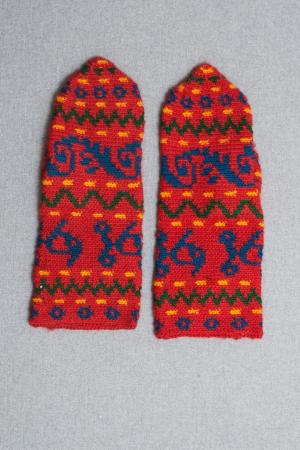 A183. 29.3.1926 Pörtom Kyrkobyn Ett par vantar, virkade i samma färger som föreg. Virkad på beställning av Yngvar Heikel. Kommentar: Nya. B: 10 cm, H: 25 cm.
