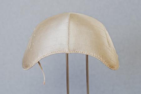 framtill, sex veck i vinkel. Foder av kattun, röd botten med beige blommor. Dragband av linnekantband. Mycket välbevarad. B: 18 cm, H: 7 cm.