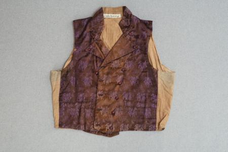 Väst av brunviolett siden med violetta invävda blommor, ståndkrage med trubbvinkliga hörn, uppslag, 1+1+5 par överklädda kullriga knappar i två konvergerande rader, 2 snett sydda fickor, bomullsrygg utan tränsar.