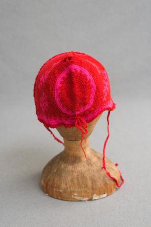 Röd mössa virkad som en luva i grannrött med ljusröda blommor på, flätade band att knyta under hakan o. ändar att snöra till i nacken.