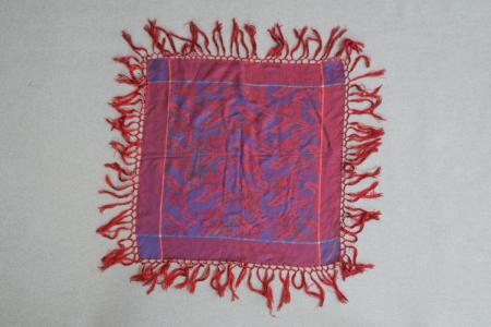 A231. ? Rödblommig liten sidenduk c. 52 x 52 cm. Kommentar; Blåröd sidensjal med lite vitt. Tjock knuten frans i rött. Välbevarad. B: 47 cm, H: 47 cm + frans: 12 cm.