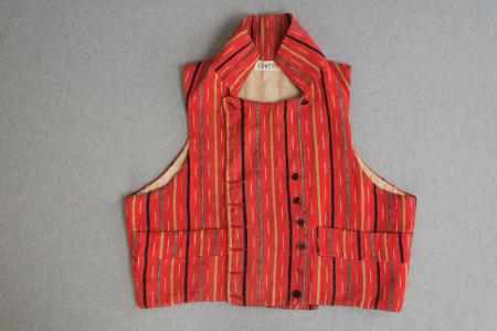 Väst av rödbottnigt tyg med ränder i svart, gult, svartvitt o. rödvita flammor, knapphål i rött, 8 cm hög krage med trubbvinkliga hörn, 1+6 par gredelina spegelglasknappar i i två lodräta rader, två rakt sydda fickor, rätvinkliga hörn nedtill, svängda sidsömmar i ryggen, inga tränsar, vitt lärft-foder.