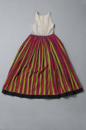 Kjol med gräsgröna bottnar o. symmetriska ränder i svart, mörkblått, 3 slags rött o. smal vit rand i mitten i varannan rand. I varannan svart