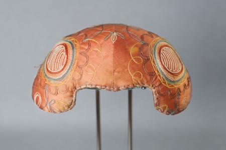 Broderad styckomössa med spets rödbrun botten, broderier i kedjesöm, nackrosetten saknas.
