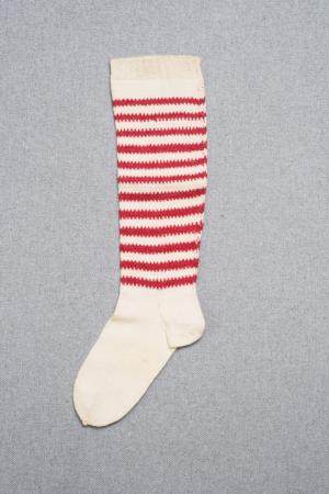 Barnstrumpa med ränder i vitt och rött.
