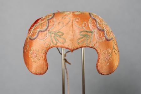 Styckomössa av terracottafärgat siden med broderier o. med rosett i nacken av samma tyg.