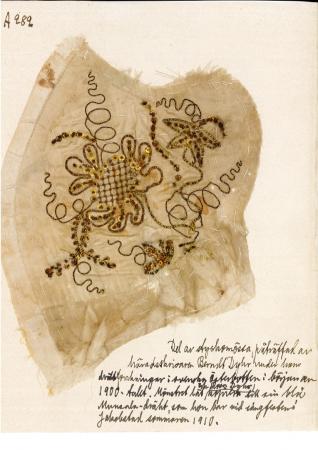Gåvolapp med texten ”del av styckemössa, påträffad av häradsskrivaren Berndt Dyhr under hans dräktforskningar i svenska Österbotten i början 1900-talet. Mönstret lär kopierats till bland annat Munsala dräkten, som Rosa Dyhr bar vid Sångfesten i Jakobstad sommaren 1910”.