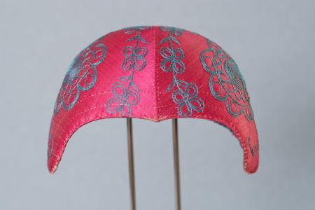 Vinröd styckomössa (utan rosett) med broderier, fem veck i vinkel.