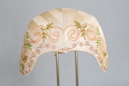 Randigt benfärgat siden, broderad med tambursöm i framkanten. Svagt hjärtformad framkant, en stickning. Kantad med smalt sidenband i mössans färg (jämför A295 och A296). Sex veck i vinkel, linnefoder, dragband