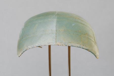 Kommentar: Liten bindmössa av svagt grön sidenatlas. Stickningar i grupper som dekoration. Sex veck i vinkel. Svagt rosa linnefoder, dragbanden avbrutna. Trasig i framkanten. B: 15 cm, H: 4 cm.