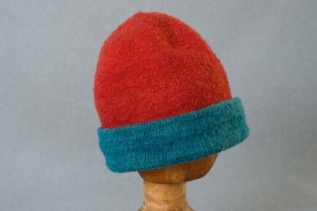 Kommentar: Slätstickad luva i två färger, Uppvikt kant i blått och resten röd. Lite filtad. B: 26 cm, H: 23 cm, blå bård: 6 cm.