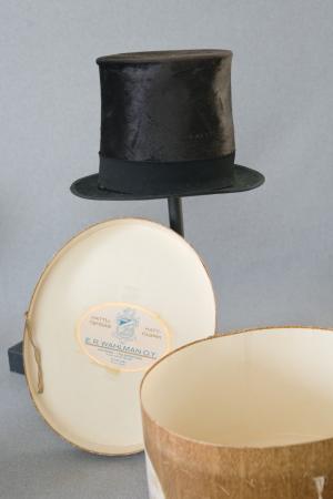 Cylinderhatt, högre modell, sidenfelb. Något konisk upptill, stöd av papp. Hattband av svart kläde. B: 17,5 cm, H: 18 cm, H: 19 cm, brätte: 4 cm.