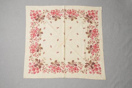 Kommentar: Bomullsjal med tryckt blommönster. Rosa blommor, bruna blad på naturvit botten. Tät kvalité. 79 cm x 78 cm.