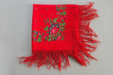 Kommentar: Yllemuslinsduk med tryckta rosor på grannröd botten. Satinränder i rött i varpriktningen. Några fläckar och mindre hål. 155 cm x 124 cm + frans 17 cm.