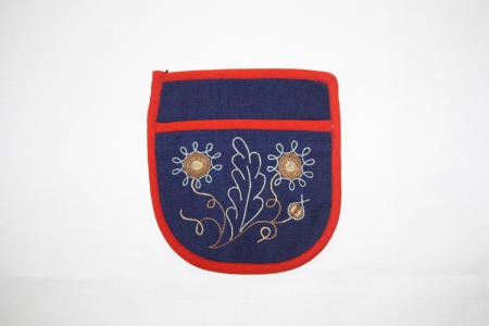 Kjolsäck, blå botten, röda kanter, broderad. Från Strömfors.