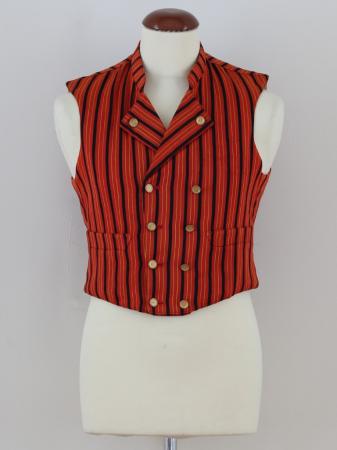 Heikels ursprungliga anteckning: Väst, röd botten, svarta och smala gula ränder, uppstående krage, uppslag 1+1+4 par knappar, 2 snett sydda fickor, rygg av samma tyg.
