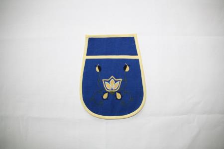 Kjolsäck, blå botten, gula kanter, broderaderier i gult, vitt, grönt och svart. Från Esbo.