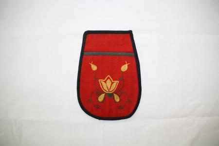 Kjolsäck, röd botten, svarta kanter, en grön kant, broderad. Från Kyrkslätt.