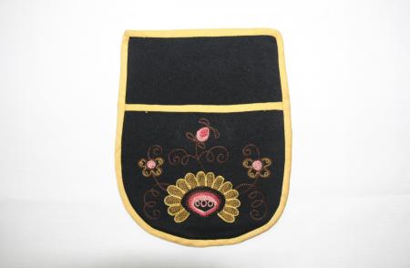 Kjolsäck, svart botten, gula kanter, broderier. Från Pernå.