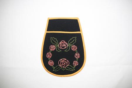 Kjolsäck, svart botten, orangefärgade kanter, 2 stora och 6 små rosor med blad. Från Snappertuna.