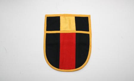 Röda kvinnodräkten. Kjolsäck, enkelficka, sydd av lappar i svart, gult, rött, gula kanter. Från Korsholm.