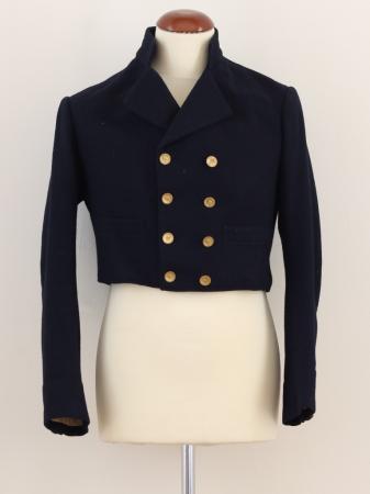 Heikels ursprungliga anteckning: Rock av mörkblå vadmal med uppstående krage och 4 par (krusiga) mässingsknappar i två rader, ärmuppslag med 3 små knappar, två rakt sydda fickor, slät i ryggen, kort.