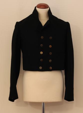 Rock, svart, midjelång, ståkrage, knäppt med 5 par stora släta mässingsknappar, i ryggen mittsöm och svängda sidsömmar, ärmuppslag med 3 små mässingsknappar.