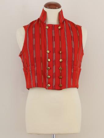Heikels ursprungliga anteckning: Väst av rödbottnigt tyg med tre slags ränder med tandning och plättar i en del ränder, uppstående krage, knäpppes tätt under hakan, par små släta mässingsknappar i två rader, samma tyg i ryggen.