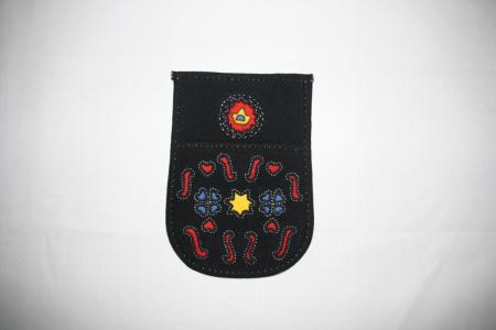 Kjolsäck svart med urklippta figurer sydda i langettsöm med olika färgade botten under enkel ficka. Från Helsinge.