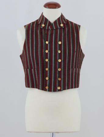 Väst av osymmetriskt randat tyg med blågrå botten och ränder i svart, vitt, grått, grönt, gredelint och rött, med nedvikt krage och uppslag knappar på uppslagen, 6 par knappar i lodräta rader, två rakt sydda fickor, ryggstycke av samma tyg, tillsnöres med spänne. Från Karis.