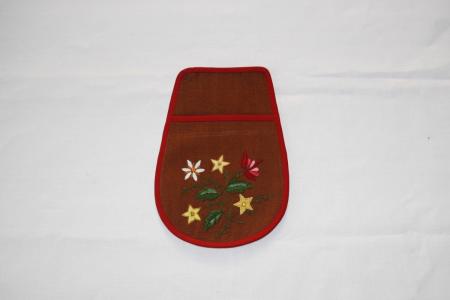 Brun med röda kanter. Rak ficka. Broderier i grönt, gult, rött, rosa, orange och vitt. Från Nykarleby.