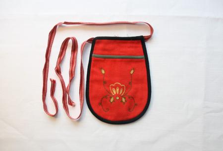 Röd med svarta kanter, grön kant vid fickan. Broderier i gult och grönt. Från Tenala.