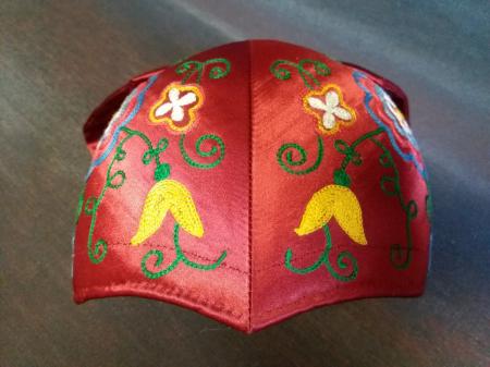 Mörkröd med broderier i blåa nyanser, rosa, vitt, gult och grönt. Från Tenala.